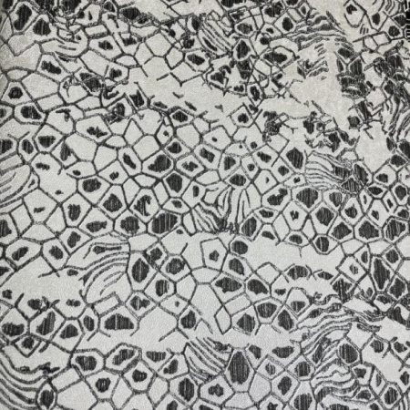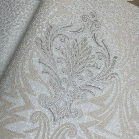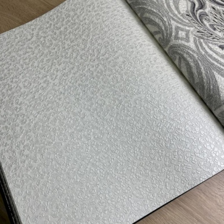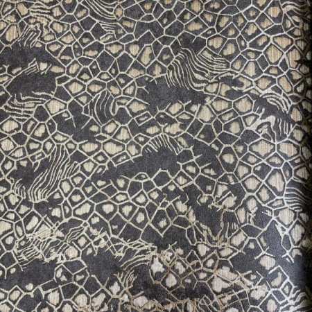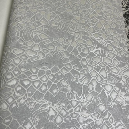 Второй сет - это оригинальные изгибы дамаска, скомбинированные с полотнами, имитирующими шкуры животных, и небрежной эстетикой имитации штукатурки. Однотонные полотна с объемными кракелюрами позволят разнообразить дизайн и визуально сегментировать пространство.